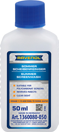 RAVENOL Sommer-Scheibenreiniger 1: 10 обеспечивает идеальную чистоту фар, лобового и заднего стекла, быстрое удаление следов насекомых, масляной плёнки и иных загрязнений. Содержит современные моющие ингредиенты (детергенты-дисперсанты), которые эффективно удаляют загрязнения, связывают абразивные частицы и выносят их из области работы щеток. RAVENOL Sommer-Scheibenreiniger 1: 10 предназначена для летнего использования при температуре окружающего воздуха выше +5°С.